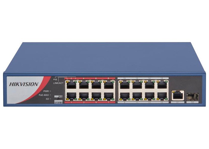 Switch 18 porte. Poe: 16: IEEE 802.3af, IEEE 802.3at. Tipologia: 10/100. Poe Budget Singola Porta: 30 W. PoE Budget Totale: 130 W. distanza Poe: Extended Mode 300 m (Porta 9:16). Uplink: 2. Tipologia Uplink: Gigabit, SFP, Tipo: L2 Unmanaged. Case: Metallico. Banda: 7.2 Gbps. Funzionalità: 6 kV Surge Protection, Temperatura di funzionamento: -10 °C ~ +55 °C. Alimentazione: 100-240 Vca, 2.5 A