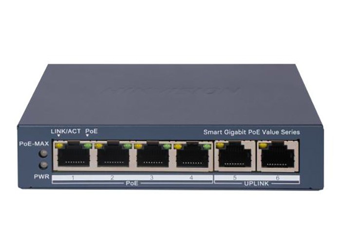 LSwitch 6 porte. PoE: 4x IEEE 802.3af,IEEE 802.3at. Tipologia: 10/100/1000. Tipo Poe: 30 W. Budget Totale: ? 45 W. Distanza Poe: Extended Mode 300 m. Uplink: 2. Tipologia Uplink: RJ45 10/100/1000 Mbps, Tipo: L2 Smart Managed. Case metallico. Capacità Switching: 14 Gbps. Funzionalità: Supporta Hik-Central/iVMS 4200/Hik-Partner Pro Unified Topology Management, cloud management. Temperatura di funzionamento: 0 °C ~ +40 °C. Alimentazione: 54 Vcc, ? 50 W