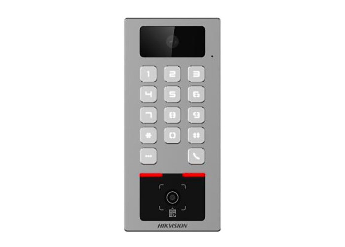 Terminale M Card/D Card QR Code da esterno con tastiera e autenticazione Bluetooth con telecamera integrata risoluzione 2MP, Capacità di memorizzazione Tessere: 100.000, Eventi: 300.000, Interfacce di Comunicazione TCP/IP, Wi-Fi, RS-485, Wiegand W26 e 34, controllo remoto mediante Hik-Connect mobile app, Interfaccia WEB, Programmazione diretta in modalità Access Point, Interfacce Lock control x1, Exit button x1, Door contact input x1, Alarm Input x1, Alarm output x1, Tamper Alarm x1, Audio bidirezionale tramite protocollo SIP 2.0, Alimentazione 12 Vcc. Temperatura di esercizio -40 °C ~ +70 °C, Umidità di esercizio 10% / 90%, Grado di protezione IP65, IK09. Dimensioni 81.0x177.0x25.mm